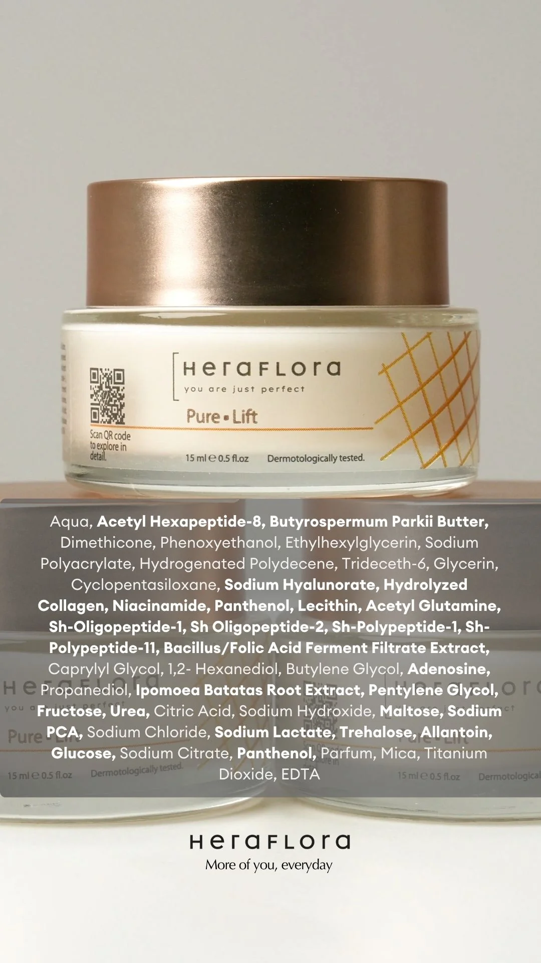 Aqua, Acetyl Hexapeptide-8, Butyrospermum Parkii Butter,Dimethicone, Phenoxyethanol , Ethylhexylglycerin ,Sodium Polyacrylate, Hydrogenated Polydecene, Trideceth-6, Glycerin, Cyclopentasiloxane,Sodium Hyalunorate, Hydrolyzed Collagen, Niacinamide, Panthenol, Lecithin, Acetyl Glutamine, Sh-Oligopeptide-1, Sh-Oligopeptide-2, Sh-Polypeptide-1, Sh-Polypeptide-11, Bacillus/Folic Acid Ferment Filtrate Extract, Caprylyl Glycol, 1,2- Hexanediol, Butylene Glycol,Adenosine,Propanediol,Ipomoea Batatas Root Extract, Pentylene Glycol, Fructose ,Urea ,Citric Acid ,Sodium Hydroxide ,Maltose ,Sodium PCA ,Sodium Chloride ,Sodium Lactate ,Trehalose ,Allantoin ,Glucose, Sodium Citrate, Mica, Titanium Dioxide, EDTA