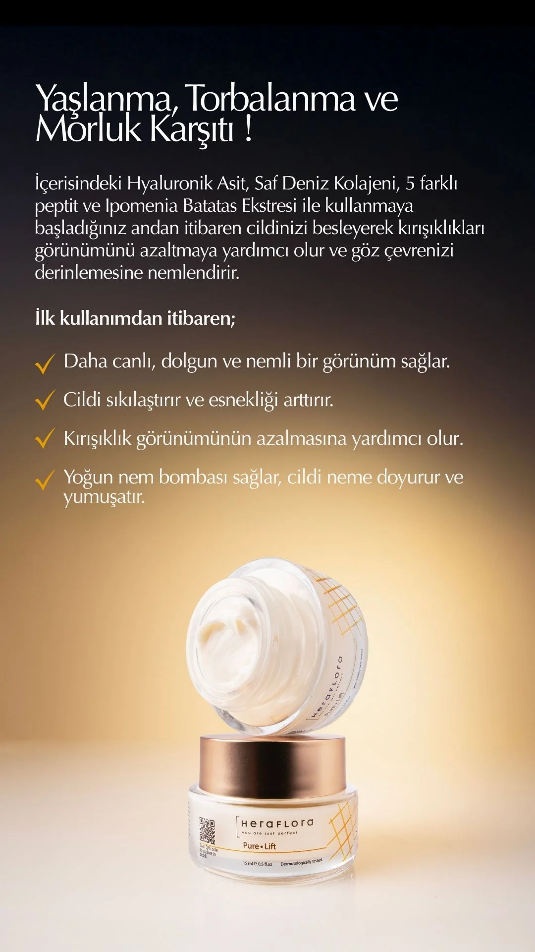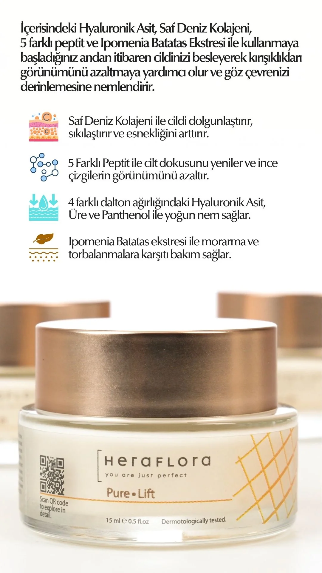 Pure Lift Yaşlanma Karşıtı ve Yoğun Nemlendirici Göz Çevresi Bakım Kremi, beş farklı peptit ve güçlü aktif bileşenleriyle kullanmaya başladığınız andan itibaren cildinizi besleyerek kırışıklıkları görünümünü azaltmaya yardımcı olur ve göz çevrenizi derinlemesine nemlendirir. Kullandığınız andan itibaren aydınlık, genç ve sağlıklı görünümü keşfedin.