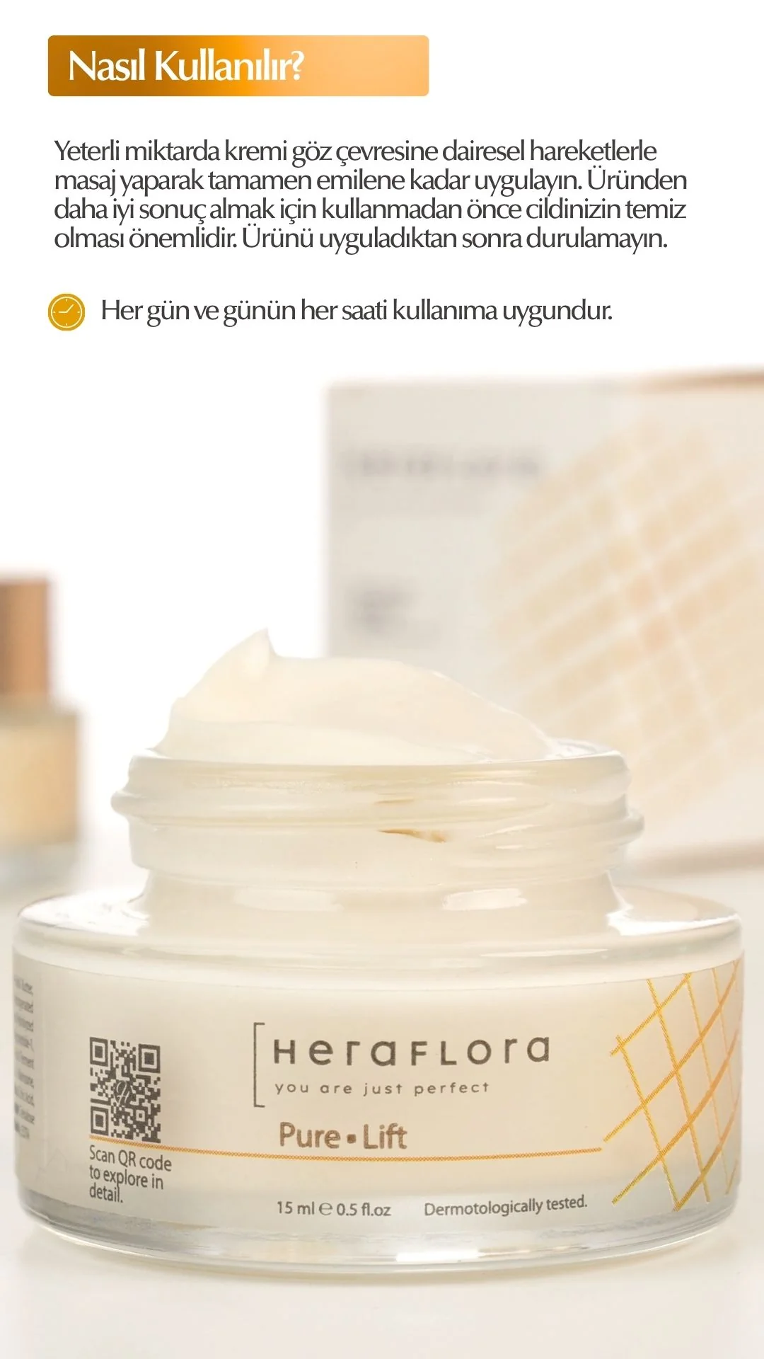 Kullanımı: Yeterli miktarda kremi cildinize dairesel hareketlerle masaj yaparak tamamen emilene kadar uygulayın. Üründen daha iyi sonuç almak için kullanmadan önce cildinizin temiz olması önemlidir. Ürünü uyguladıktan sonra durulamayın.